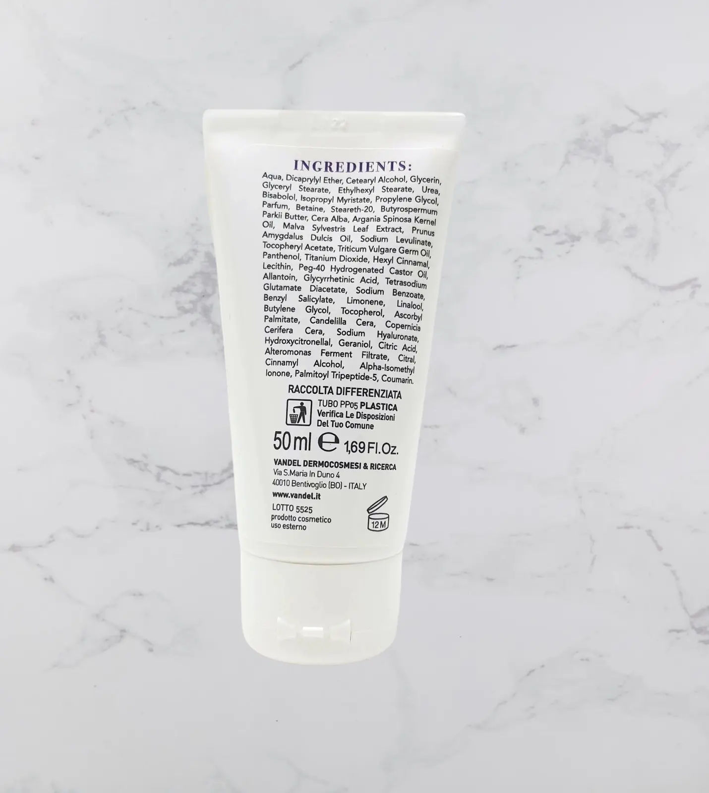 Ingredients: Aqua, Dicaprylyl ether, Cetearyl alcohol, Glycerin, Glyceryl stearate, Ethylhexyl stearate, Urea, Bisabolol, Isopropyl myristate, Propylene glycol, Parfum, Betaine, Steareth-20, Butyrospermum parkii butter, Cera alba, Argania spinosa kernel oil, Malva sylvestris leaf extract, Prunus amygdalus dulcis oil, Sodium levulinate, Tocopheryl acetate, Triticum vulgare germ oil, Hexyl cinnamal, Panthenol, Titanium dioxide, Hexamethylindanopyran, Lecithin, PEG-40 hydrogenated castor oil, Allantoin, Glycyrrhetinic acid, Tetrasodium glutamate diacetate, Sodium benzoate, Linalool, Benzyl salicylate, Limonene, Butylene glycol, Hydroxycitronellal, Tocopherol, Linalyl acetate, Ascorbyl palmitate, Candelilla cera, Copernicia cerifera cera, Sodium hyaluronate, Pogostemon cablin oil, Geraniol, Citric acid, Citral, Alteromonas ferment filtrate, Alpha-isomethyl ionone, Palmitoyl tripeptide-5, Cinnamyl alcohol, Coumarin.