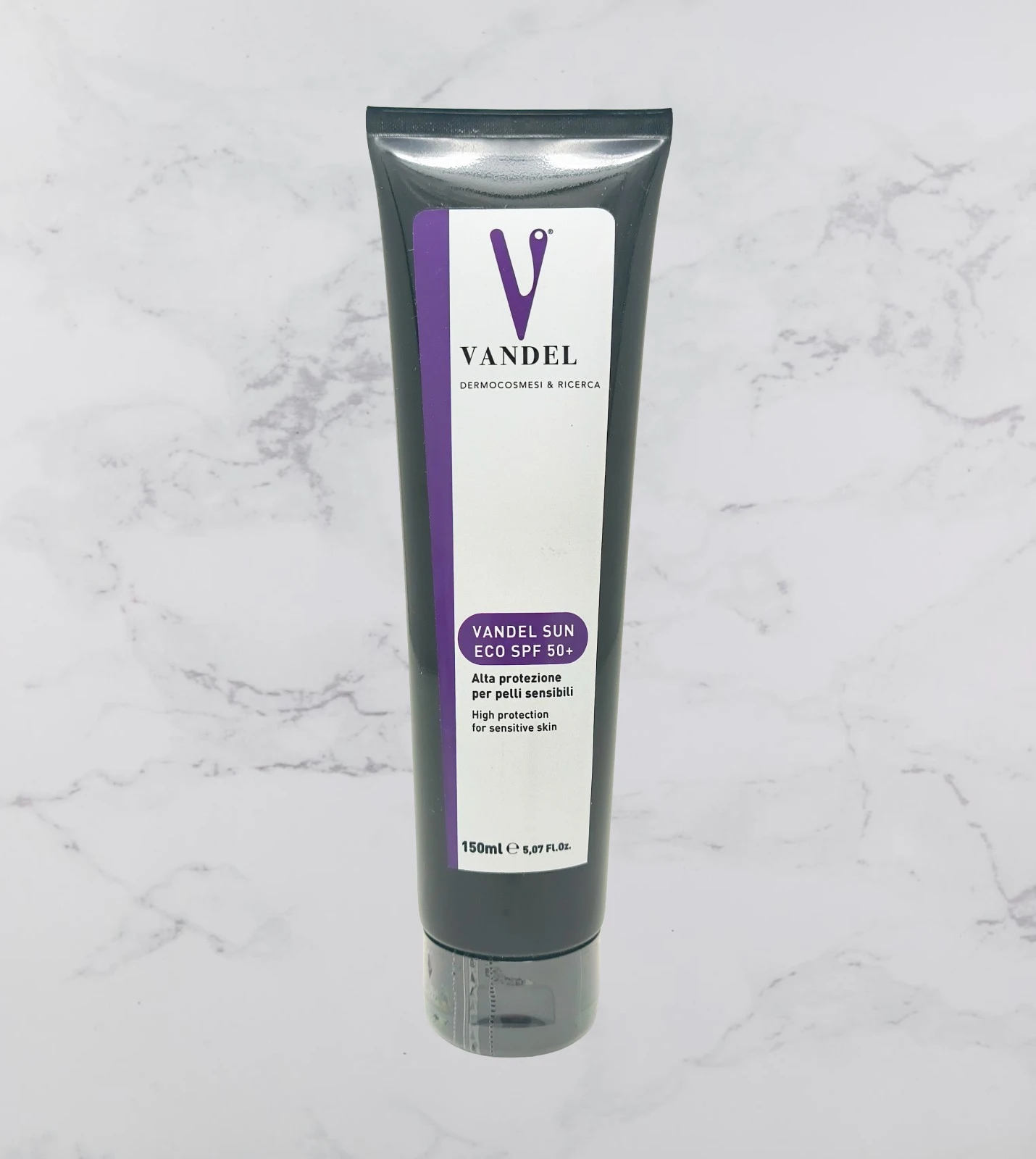 Dall’esperienza dermatologica VANDEL SUN ECO 50+ FPS crema solare ad ampio spettro,  contenente un innovativo sistema filtrante fisico , non allergizzante e   approvato da Hawaiian Reef Act . Ad ampio spettro di protezione da radiazioni solari e cosmiche  nella banda UVB ed UVA, riduce il rischio di alterazioni cutanee collegate alla fotoesposizione.  Formula “amica della barriera corallina”, senza filtri nocivi per la pelle. Previene macchie e rugosità, ideale anche dopo trattamenti estetici invasivi  a rischio di fotosensibilità. Resistente all’acqua.